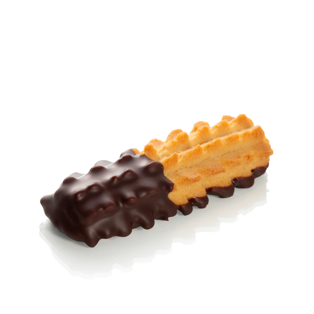 Whatever your taste, once you've bitten into the Chocolate Spritz, it reveals the full depth of flavour of its ingredients: Indulgent buttery flavours, subtle almond tones and the delicate sweetness of vanilla, flavouring its dough… Half-coated in a fine layer of dark chocolate!