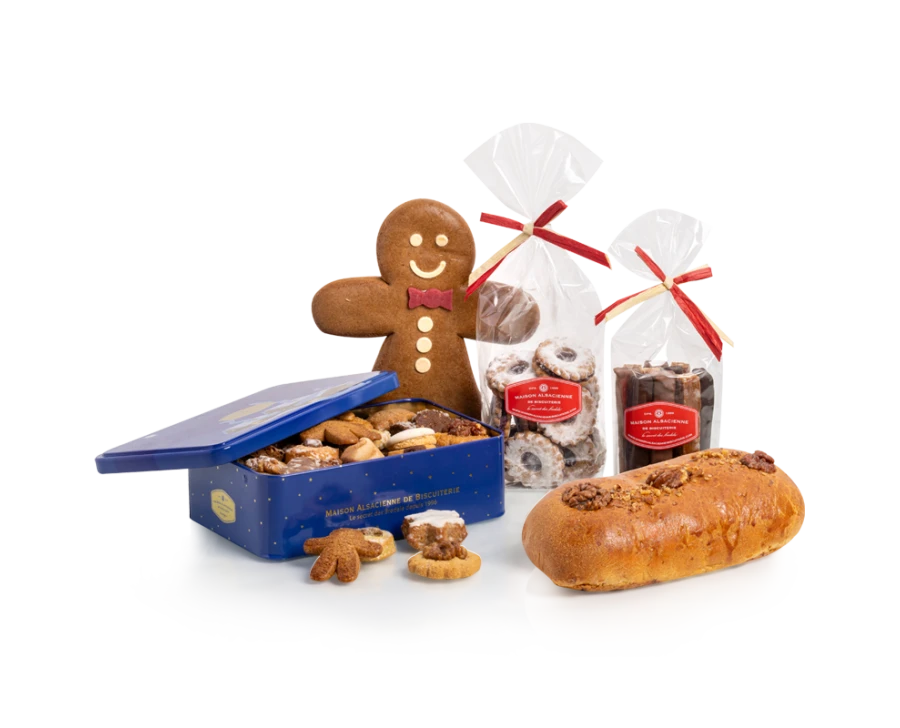 - Bredele assortment – Christmas Tin (400g tin): all the taste of our Maison, in a beautiful limited edition tin, for delectably festive celebrations. Small soft biscuits, butter biscuits and gingerbreads… The perfect assortment for discovering the art of biscuiterie - and savour - the diversity of our Alsace treasures.