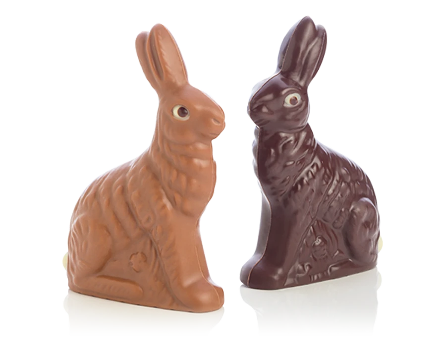 Our Duo of Easter Bunnies, in milk and dark chocolate (minimum of 58% cocoa with premium origins), is made using traditional moulds passed down over the generations, carefully hand-decorated by our chocolatiers.