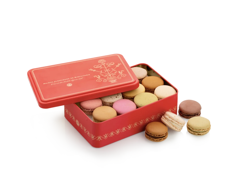 Carefully placed in a beautiful tin with a typical Alsace design, you'll find an indulgent and varied selection of Macarons with classic flavours, fruity versions and original creations...