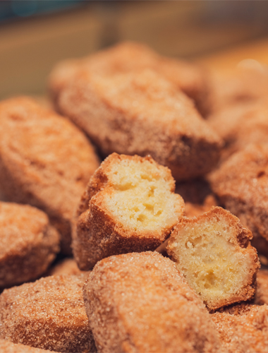 Traditionnellement fabriqués pour Carnaval, nos Schenkele sont des petits beignets confectionnés avec de la farine d’épeautre issue de l’agriculture biologique, parfumés au citron et au Kirsch d’Alsace puis roulés dans du sucre-cannelle.