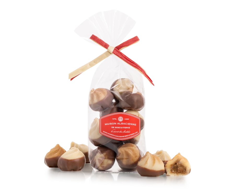 Du caramel ou du pralin, sous une fine couche de chocolat