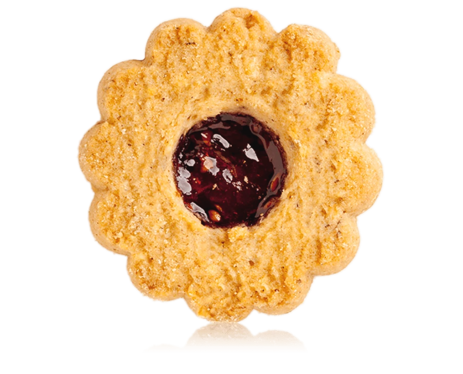 Une tartelette sablée pur beurre, à la noisette et parfumée de cannelle. Ce biscuit croquant offre un cœur de confiture à la framboise...