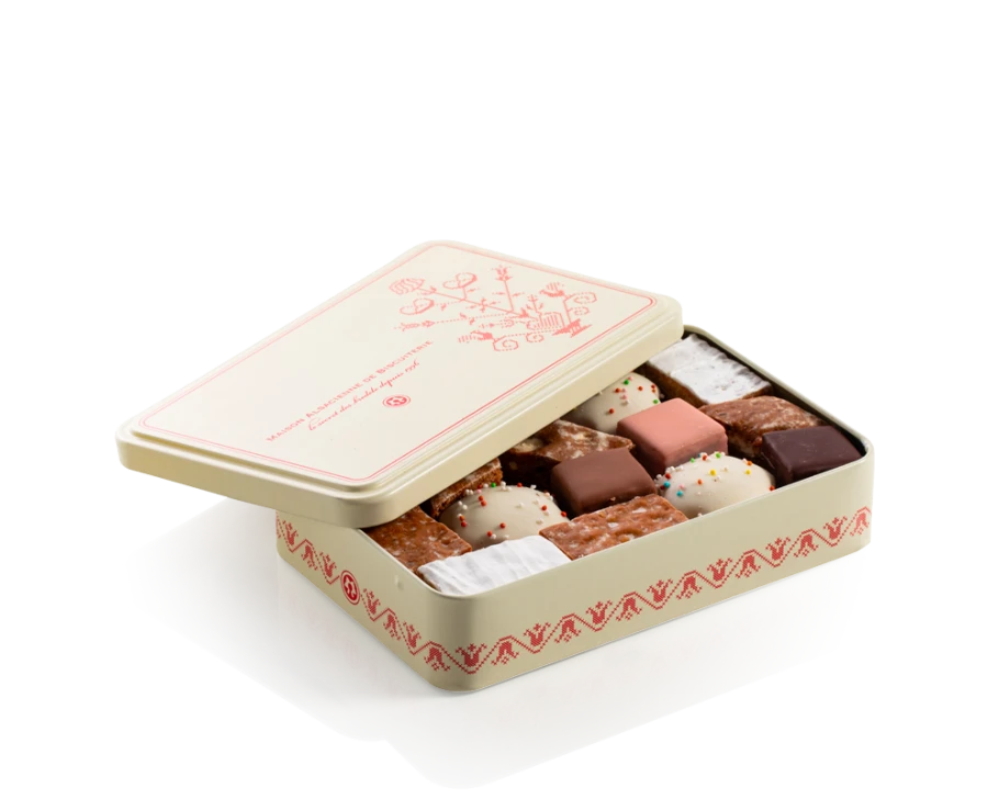 Vous retrouverez dans cet assortiment des petits pains d’épices de Noël typiques de notre région, mais aussi des spécialités d’inspiration et aux consonances helvétiques, comme les Leckerli, ou bien encore des créations exclusives telles que le Gingerli : un petit gâteau au gingembre que notre Maison est la seule à confectionner ! Une diversité de recettes qui concède à notre assortiment sa belle palette gustative...