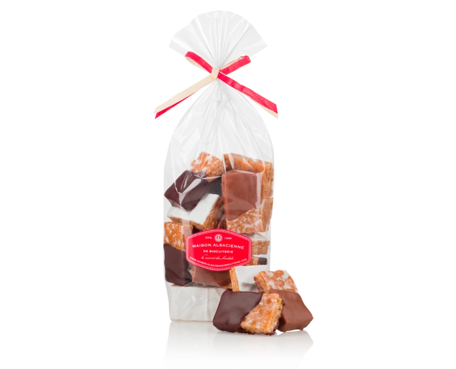 Aujourd’hui, de nombreuses variantes de Leckerli sont confectionnées par nos amis et voisins suisses, mais aussi par les familles alsaciennes. La recette traditionnelle de notre Maison est confectionnée avec des ingrédients de qualité : la pâte est agrémentée d’un mélange d'amande, d'écorces confites d'orange et de citron et parfumée avec du Grand Marnier. Le glaçage au sucre a la délicieuse particularité d’être réalisé avec du Kirsch (eau de vie de cerise). Ajouter à cela les épices pour une harmonie subtile.