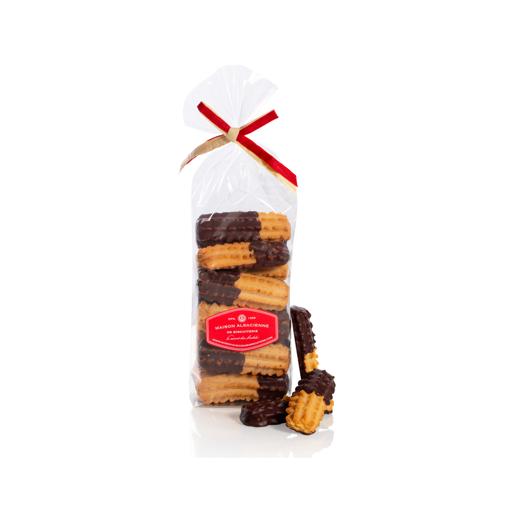 Le Spritz est un grand classique bien connu des amateurs de Bredele ! Alors quand les pâtissiers de notre Maison décident de revisiter sa recette en le parant d’un chocolat noir, notre dernière création est encore plus gourmande !