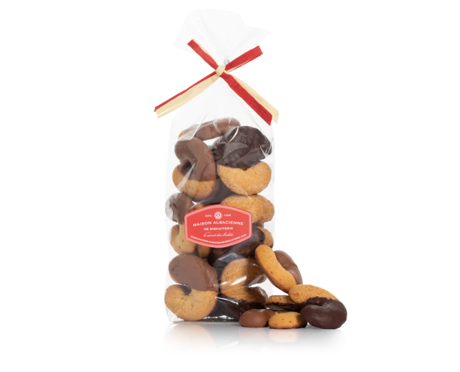 Pour encore plus de gourmandise, les pâtissiers de notre Maison ont enrobé d’une fine couche de chocolat la juste moitié de ces deux bredele sablés. Si leur couleur dorée et leur teinte chocolatée offrent un joli contraste de couleurs, leurs saveurs vont de pair, comme une évidence gourmande...