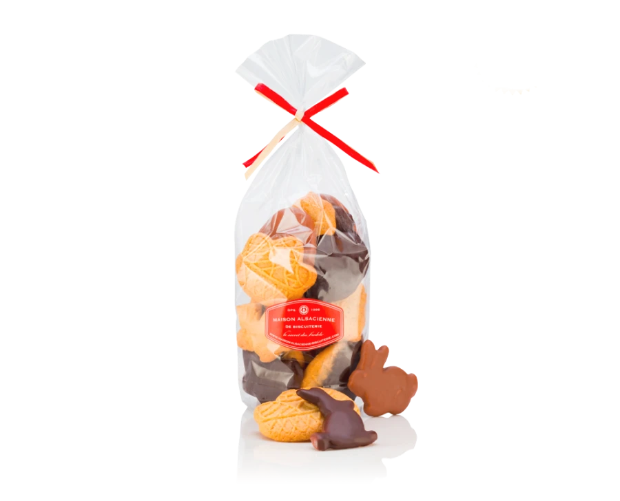Ces biscuits en forme de lapin de Pâques, de poussin, d’œufs et de panier d'œufs sont des sablés fins au beurre frais, parfumés à la vanille. Natures, enrobés de chocolat au lait ou de chocolat noir (58% de cacao minimum), nos sablés sont simples et bons !
